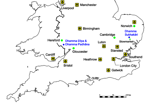 The most convenient airport for Dhamma Sukhakāri is London Stansted (STN), to which there are budget flights from a wide range of European destinations.